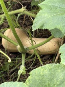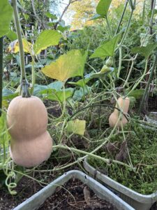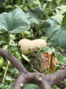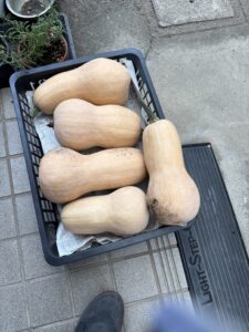 気がつけば庭じゅうがバターナッツの蔓とハート形の葉で覆われ、まるで小さなジャングルのように。なんと今年は7つの実をつけてくれました。現在、まだ3つほど緑色で未収穫状態。こちらも楽しみです。